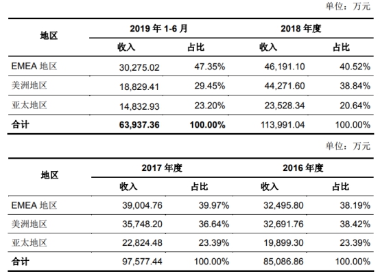 招股说明书显示,2016年至2019年上半年,公司销往美洲地区(主要出口美国)的收入分别为3.27亿元、3.57亿元、4.43亿元、1.88亿元,占总营收比重分别为38.42%、36.64%、38.84%、29.45%,近四成收入来自美国。