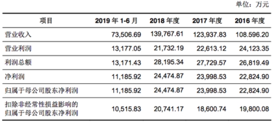 2016年至2019年上半年,公司营业收入分别为10.86亿元、12.39亿元、13.98亿元和7.35亿元,净利润分别为2.28亿元、2.40亿元、2.45亿元和1.12亿元。