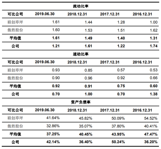 同行可比公司的资产负债率均值为47.47%、43.95%、40.45%和37.25%,流动比率均值为1.31、1.40、1.49和1.61,速动比率均值为0.60、0.75、0.91和0.92,与共创草坪差别不大。