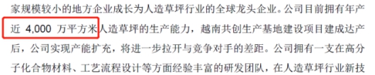 在共创草坪招股书“发行人主营业务及市场地位”这一章节中,共创草坪表示:“公司目前拥有年产近4000万平方米人造草坪的生产能力,越南共创生产基地建设项目建成达产后,公司实现产能扩充,将进一步拉开与竞争对手的差距。”