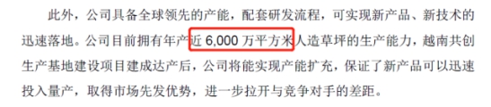 但是在招股书“持续提高的技术水平和稳步扩张的生产能力保证公司产品优势”这一章节中,共创草坪又表示:“公司目前拥有年产近6000万平方米人造草坪的生产能力,越南共创生产基地建设项目建成达产后,公司将能实现产能扩充,保证了新产品可以迅速投入量产,取得市场先发优势,进一步拉开与竞争对手的差距。”
