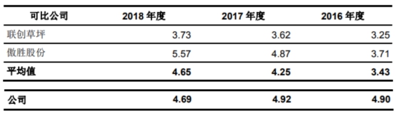 2016年至2018年,公司存货周转率分别为4.90次、4.92次和4.69次,同行可比公司的存货周转率分别为3.43次、4.25次和4.65次。