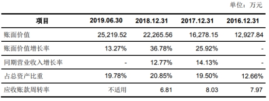 2016年末至2019年6月末,公司应收账款账面价值分别为12,927.84万元、16,278.15万元、22,265.56万元和25,219.52万元,占总资产的比例分别为12.66%、19.50%、20.85%和19.78%。同期坏账准备696.80万元、959.21万元、1532.19万元和1643.83万元。