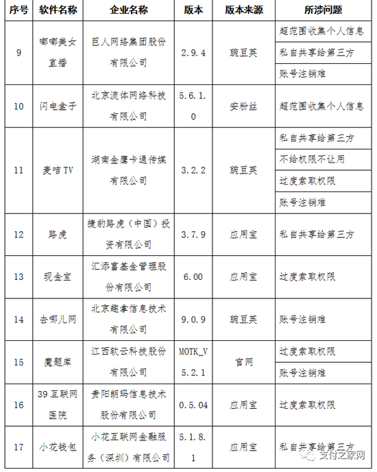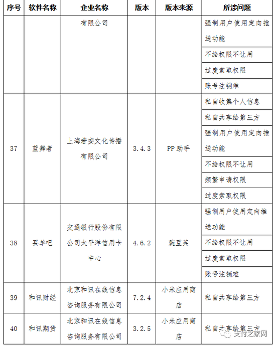 支付之家网注意到,存在问题的应用软件名单中不乏交通银行、微众银行、分众、路虎等知名公司,而交通银行信用卡旗下APP“买单吧”则成为六大国有银行中唯一一家列入“黑榜”的国有银行。