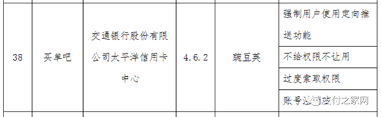 存在问题的应用软件名单(2020年第三批)的附件第38项显示,交通银行股份有限公司太平洋信用卡中心旗下APP买单吧(来源:豌豆荚,版本:4.6.2)存在强制用户使用定向推送功能、不给权限不让用、过度索取权限、账号注销难的问题。