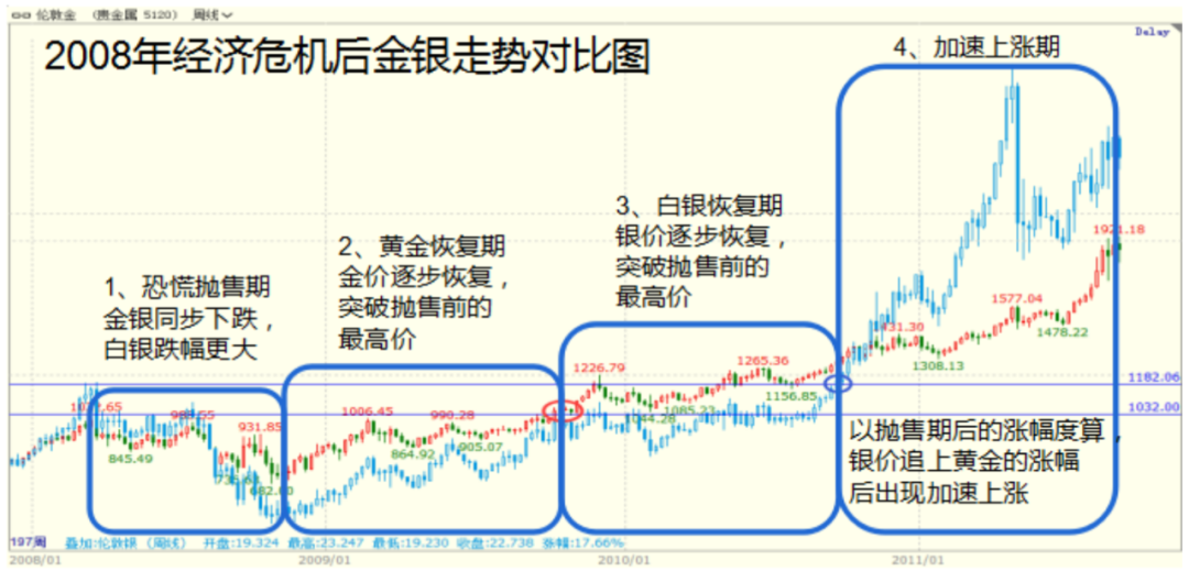 2008年国际金融危机之后,国际黄金价格出现一轮恐慌性下跌,同期白银价格跌幅更深;随着各国经济刺激政策的出台,在投资市场一个主要表现即为黄金价格较长时期的持续上涨,在这个上涨的过程中,我们通过通过金银走势对比分析,划分为以下几个阶段。如图所示,金价恢复期、银价恢复期和加速上涨期。
