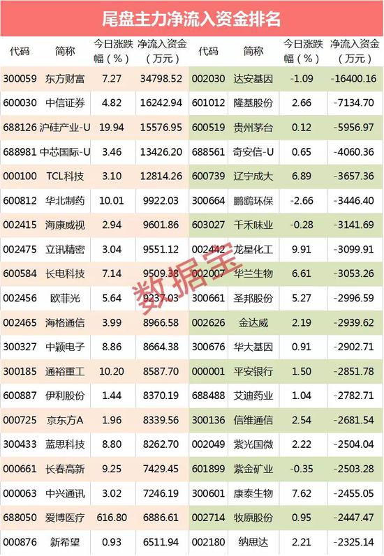 个股方面,尾盘5只个股流入资金超亿元。东方财富、中信证券两只券商股分别流入3.48亿元和1.62亿元。沪硅产业、中芯国际、TCL科技三只科技入流入资金超亿元。