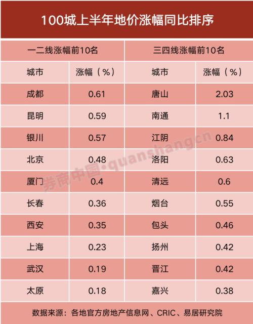 从地价涨幅排序来看,在全国36个一二线城市中,成都、昆明和银川等地价上涨比较快,其上半年同比涨幅分别为61%、59%和57%。报告认为,这三个城市都属于西部重点城市,地价成本可控,很容易吸引房企积极进入。尤其是成都市场,其今年上半年楼市交易较为火爆,供地节奏也比较快,刺激了各类房企积极进入,进而使得地价涨幅比较大。