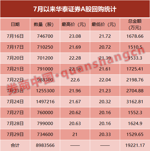 叠加7月份的回购成果,截至7月29日收盘,华泰证券已累计回购约8098.36万股,已支付总金额达到了14.77亿元。