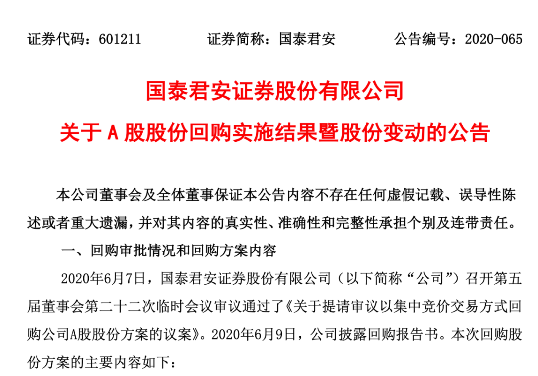 国泰君安飞速完成回购