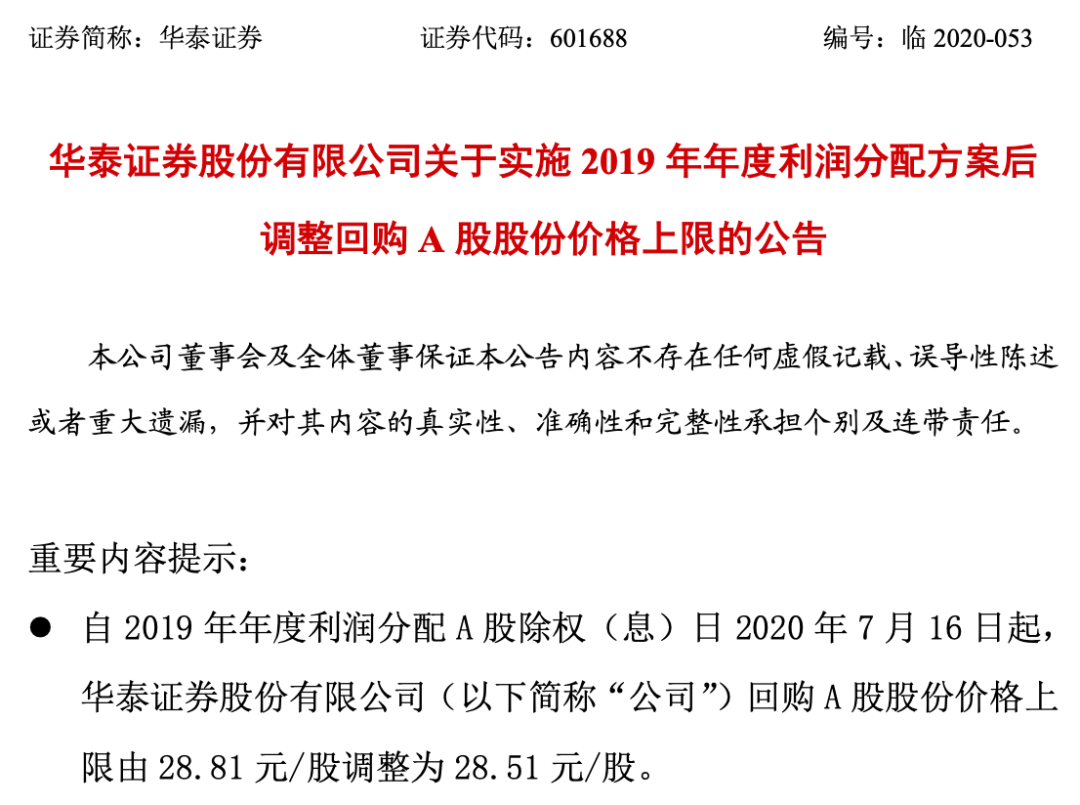 值得注意的是,从7月16日开始,受分红派息影响,华泰证券的回购价格上限由每股28.81元调整为了28.51元。