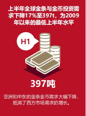 全球金条与金币总投资量在第二季度大幅下滑,这令上半年的需求降至11年来的最低水平396.7吨,同比降幅为17%。东西方投资者行为在该投资领域截然相反:在多数亚洲与中东市场表现疲软的同时,西方市场的金条与金币投资者表现与黄金ETF投资者类似,推升了该领域需求。