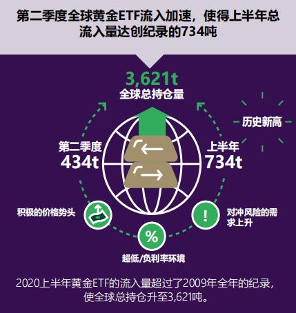 全球各国央行与政府为应对疫情而采取的诸如降息与对市场进行大量流动性注入等措施,令全球黄金ETF上半年的总流入达到了734吨的纪录新高。2020上半年的总流入量超过了2009年创下的年度流入高点646吨,使得全球黄金ETF总持仓升至3621吨。