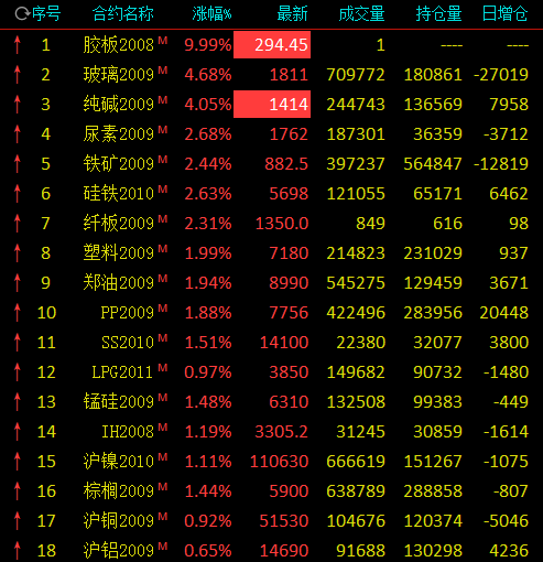 热点栏目8月4日,国内期市早盘多数上涨,纯碱封涨停,玻璃涨逾4%,尿素冲高回落涨2.68%;黑色系走升,铁矿石涨逾2%;油脂延续涨势,菜油涨近2%,棕榈油涨逾1%;能化品中,塑料、PP涨近2%;有色分化,沪镍涨逾1%,沪铜涨近1%,沪锌、沪铅走跌。
