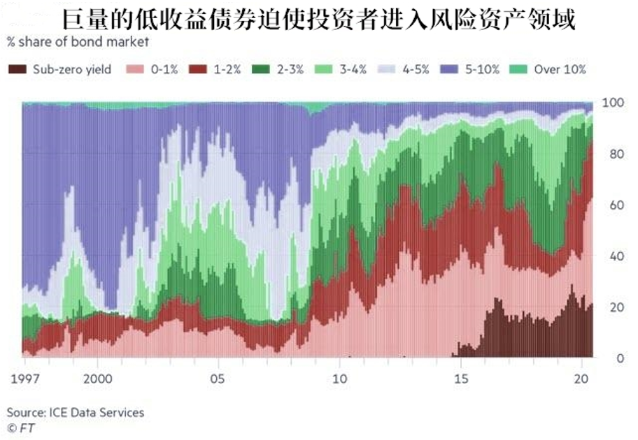 根据英国《金融时报》的数据,截至6月30日,ICE Data Services追踪的规模60万亿美元的全球债券市场中,有86%的债券收益率不高于2%,有超过60%的债券收益率低于1%。