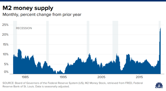 这就涉及到了货币的流通速度问题,即在经济衰退期间,如果家庭和企业注重储蓄,尽可能的减少开销,那么货币流通速度就会减缓。例如美联储向市场注入了大量的现金,导致广义货币M2激增,但是企业和消费者并不愿意把增加的美元花出去,那么这些现金将产生不了任何影响,通货膨胀也就无从谈起。