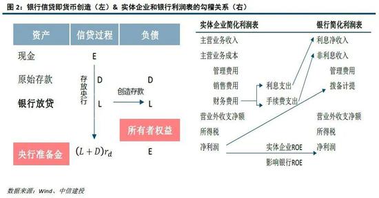 银行的业务,按生意的本质可以分为信贷业务、中间业务、投资业务和其它业务。信贷业务占比最高,贡献70.22%的营业收入;中间业务次之,贡献20.22%的营业收入。对于信贷业务,主要从“量、价、质”三个角度来分析,“量”即商业银行的总资产规模及其增速,“价”为净息差,“质”为贷款减值损失,我们用风险调整净息差(净息差-信用成本)指标来综合考虑“价”和“质”。从银行和实体企业利润表之间的勾稽关系来看,银行贷款是对实体的债权,实体企业财务费用中的利息支出和手续费支出分别对应银行的利息净收入和非利息收入;只要企业未倒闭,就需要向银行按时足额支付本息,财务费用波动相对净利润波动要小;当企业净利润长期为负时,就存在破产和违约可能,银行发生贷款本金损失的概率加大,需要计提信用减值损失或资产减值损失。实体企业的盈利能力影响银行的盈利能力,而银行的盈利能力影响其信贷规模并进而影响货币供给。