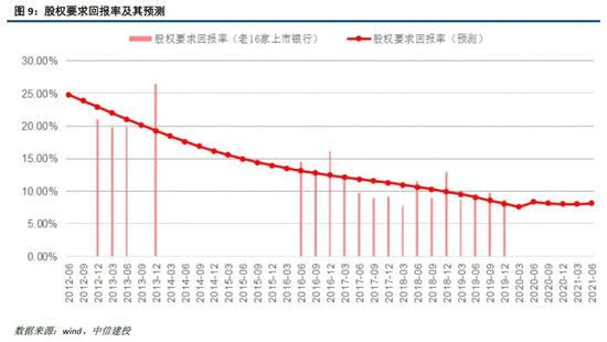 银行股(特别是中大型银行)成立时间和上市时间较久,历年ROE比较稳定,和假设条件比较匹配;且由于覆盖银行股的分析师比较多,在机构的权益类产品中持仓权重较大,从而市场对银行股的研究比较充分、定价比较合理。而且银行的主营业务就是信贷业务,各个银行之间的业务类型差别不大,个股的估值定价能够较好地被银行自身盈利能力所解释。所以,可以通过对16家上市银行的ROE和PB进行截面回归,回归系数的倒数即为股权要求回报率r_e,注意只有当回归模型的R^2大于0.5,且ROE的系数T值大于2时,计算出的股权要求回报率才有意义。历史上,股权要求回报率充分考虑了经济增长和通胀;预测2020Q2和2020Q3上市银行的股权要求回报率分别为8.33%和8.15%,低于2020Q4(8.67%)。