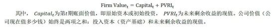 剩余收益模型使得我们可以依据企业财务报表数据估算公司价值(根据公司未来现金流计算现值),这也是该模型受欢迎的原因。从直觉上,我们可以把剩余收益模型分解为以下形式: