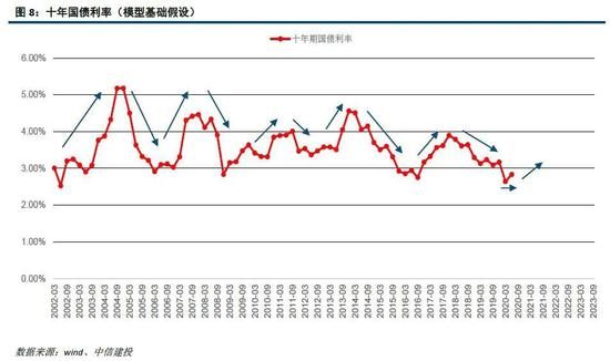 假设十年国债利率于2019Q3见底,并于2019Q4开启上涨周期。通过产业债信用利差的变动可以间接推断股权要求回报率相对无风险利率的风险溢价变动,2020年4月以来风险溢价快速下降。