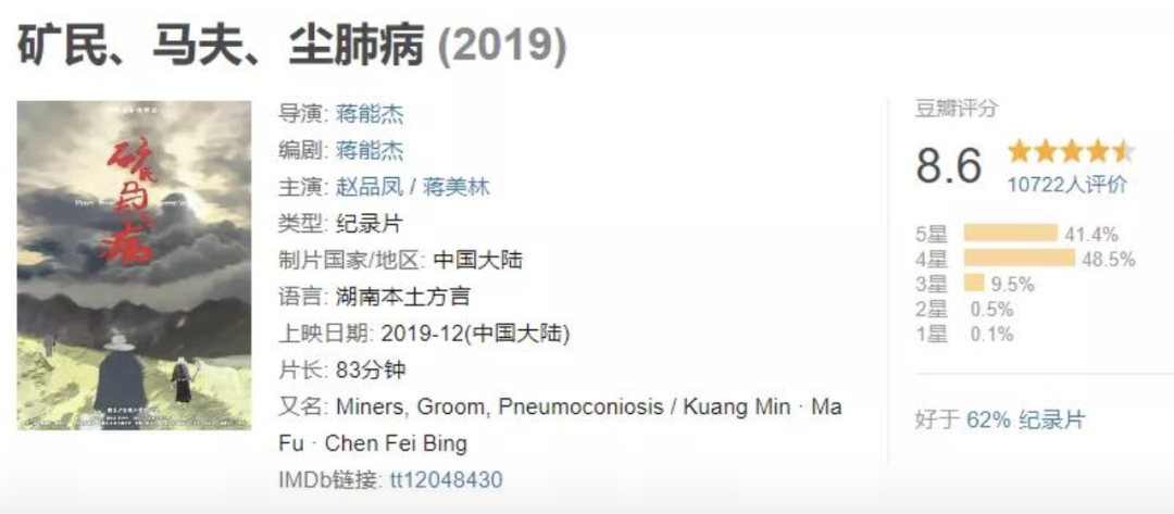 蒋能杰拍摄的另一部纪录片《矿民、马夫、尘肺病》,由于不能公映,他曾在该片的豆瓣页面守着,只要有人标注“想看”该片,他就将下载链接私信给对方。/豆瓣