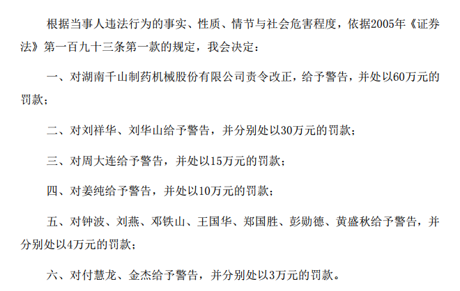 证监会对包括刘祥华、刘华山在内的13名责任人均给予警告,并分别处以3万元到30万元的罚款。同时还对刘祥华、刘华山作出市场禁入决定。