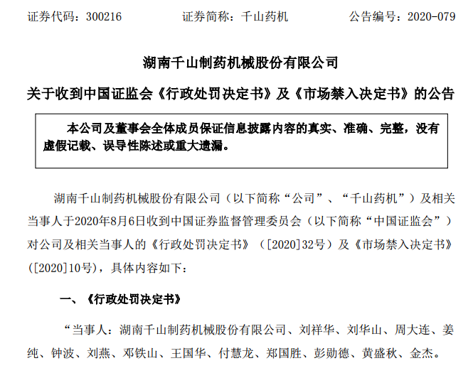 公告显示,证监会查明,千山药机存在“2015年、2016年年度报告存在虚假记载;2017年未按规定对关联方非经营性占用公司资金履行临时报告义务”的违法事实,千山药机董事长、总经理刘祥华及其胞弟刘华山操控公司资金往来,领导、决策和组织实施千山药机公司信息披露违法事项,公司财务总监周大连,财务部长姜纯领导公司财务部违规进行相关账务处理,刘祥华、刘华山、周大连、姜纯是千山药机上述年度报告虚假记载的直接负责主管人员,其中刘祥华、刘华山应承担主要责任,周大连、姜纯应承担次要责任。