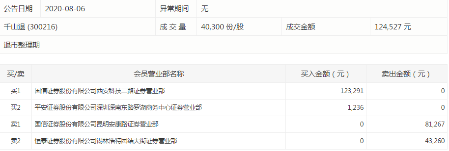 复牌当日即8月5日,千山退一字跌停,成交量比昨日还要惨,仅仅1手,成交金额343元;8月6日,同样是一字跌停,不过成交量大幅放大,达到403手,成交金额12.5万元,国信证券的两个营业部成最大的买家和卖家。截至昨日,千山退进入退市整理期后已是连续3个一字跌停。