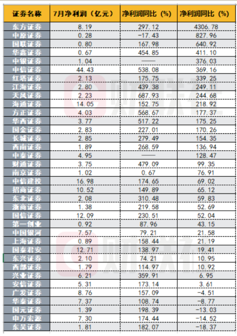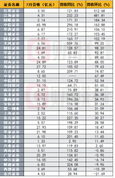 8月6日,中信证券公告,7月份母公司营收65.98亿元,环比增163.88%,净利润44.43亿元,环比增369.16%;中信建投公告称母公司7月实现营收为31.15亿元,环比增52.54%,实现净利润16.98亿元,环比增69.02%。无论是营收还是净利润,两家券商均居已公布的36家券商月报之首。