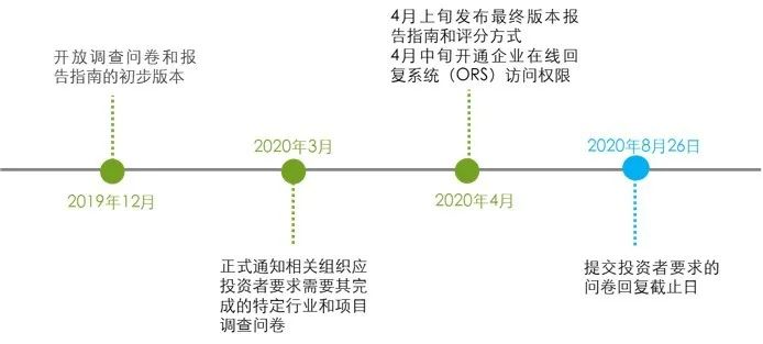 CDP问卷分为气候变化问卷(Climate)、水问卷(Water)、森林问卷(Forest),被邀请填写问卷的企业无论是否回复,均会被CDP进行打分,因此企业应及时查询是否被邀请填写问卷并积极回复。问卷在CDP官网上可直接获取,2020年CDP问卷评估流程与时间线如下,企业须在2020年8月26日前提交问卷。