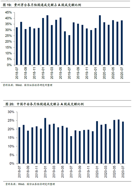 前20大重仓股中,贵州茅台、中国平安、美的集团、恒瑞医药、格力电器等股票近年来一直交易活跃。本月,贵州茅台、恒瑞医药、海康威视陆股通成交额占A股成交额的比例大幅提升;中国平安、格力集团陆股通成交额占A股成交额的比例则小幅下滑。