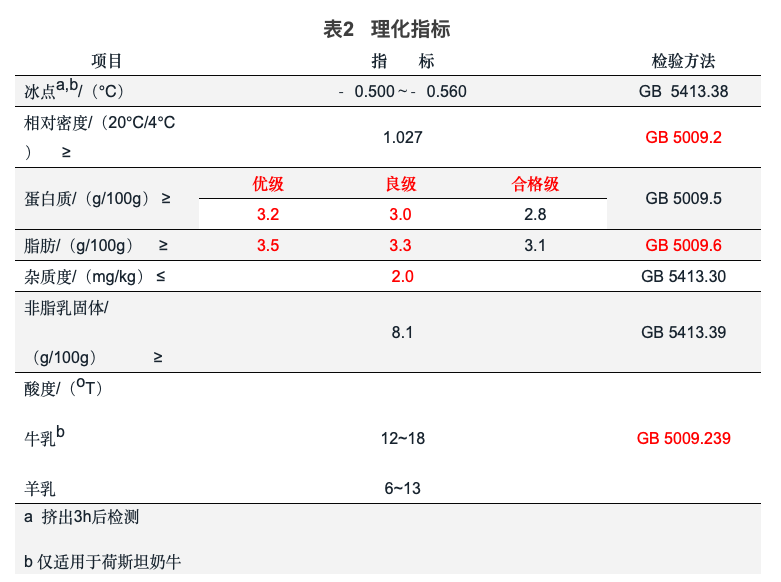 在现行生乳国标中,蛋白质达标值为2.8g/100g、菌落总数达标值为不超过200万个/mL,低于1986年的旧版生乳国标,在旧版中,生乳蛋白质达标值为2.95g/100g,菌落总数达标值为不超过50万个/mL。