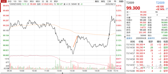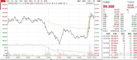 临近3点收盘,更加诡异的事情发生了:T爆拉,最高飙升到了99.345。国债期货的空头从巨赚到血亏(十年国债期货的杠杆有50倍)。