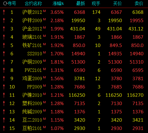 热点栏目8月18日,国内期市开盘,沪银涨近4%,沪金涨近2%,有色走升,沪锌涨逾2%,沪铜涨近2%;黑色系中,铁矿石、玻璃涨近2%。