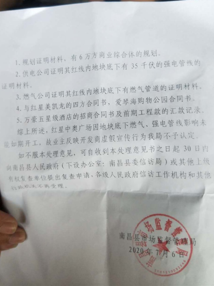 对此,中奥地产给中国网财经记者提供了一份南昌县市场监督管理局出具的相关意见书。意见书提到,红星中奥广场因地块底下燃气、强电管线影响未能如期开工,对业主反映的开发商虚假宣传行为不予认定。此外,开发商还提供了与红星美凯龙的四方合同书、爱琴海购物公园的合同书,并提供了万豪五星级酒店的招商合同书及前期工程款的汇款记录。