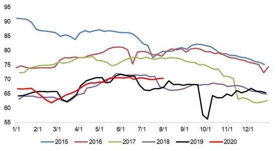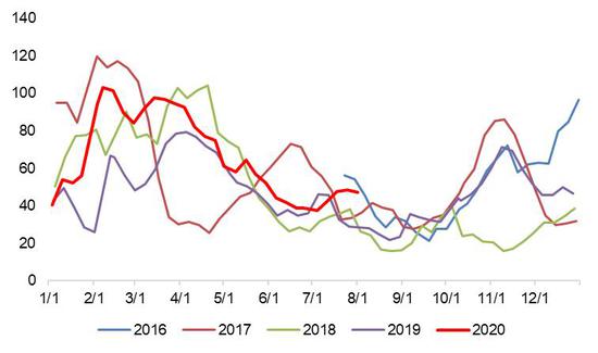 焦化厂开工率高位震荡:7月末,独立焦化厂开工率为80%,较上月同期80.3%,小幅下滑0.3pct。目前焦化行业利润受到挤压而收缩,但目前焦化行业利润依然维持较高水平,焦化行业开工率维持高位。预计后续随着钢厂利润回升,钢厂开工率回升,焦化行业利润有望回升将带动焦化行业开工率继续回升。