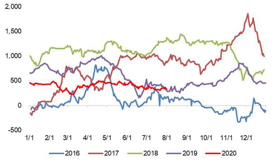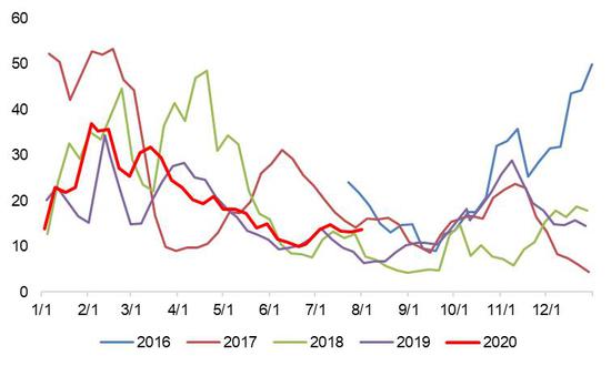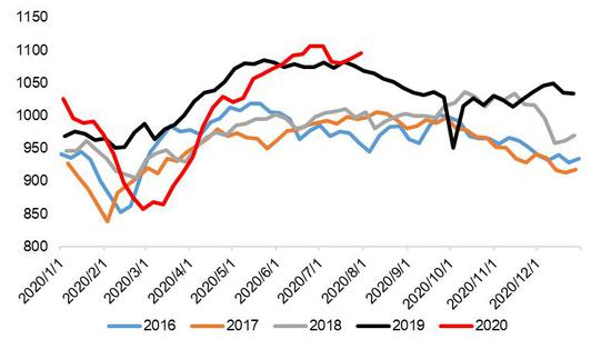钢材库存有望开始去化:7月末五大品种钢材社会库存为2228万吨,相较于6月末的2053万吨库存上升175万吨,与往年同期相比,仍处于同期高位,本月库存开始小幅累计,预计下月库存有望开始下降。