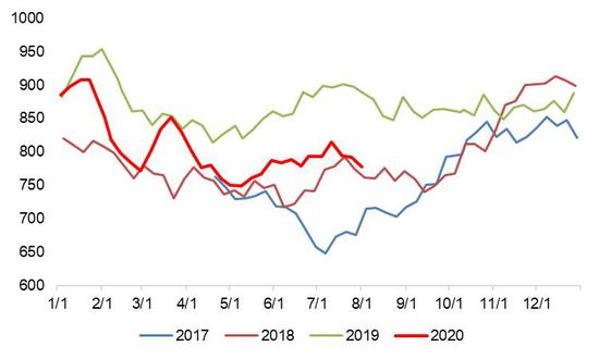 螺纹钢产量小幅回升:7月末钢材周度产量为1096万吨/周,上月同期周度产量1106万吨/周,月环比下降20万吨/周。截止7月底螺纹钢生产利润为335元/吨,上月同期为362元/吨,月环比下降27元/吨。随着下游需求的逐步回升,钢厂的利润开始回升,高炉的开工率有望继续回升,钢材的产量有望开始上升。