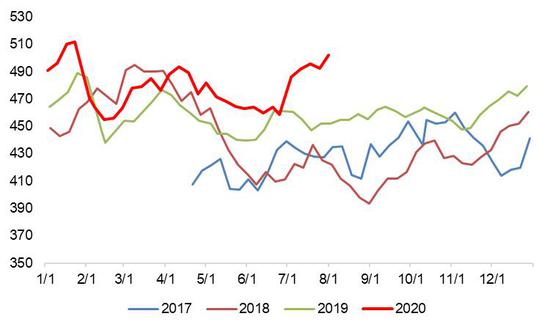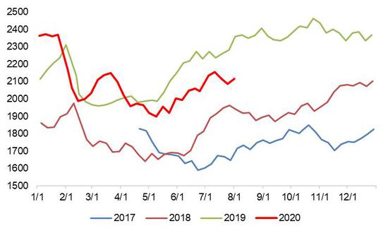 高炉开工率开始回升:7月末全国高炉开工率70.3%,较上月同期70.4%环比下降0.1pct,目前高炉开工率处于去年同期相对高位,本月下旬开工率开始小幅回升,由于下游需求开始逐渐回升,钢厂利润开始底部震荡开始回升,预计8月高炉开工率有望开始回升;2020年6月,我国生铁产量7663万吨,同比增长9.2%;1-6月生铁累积产量为4.3亿吨,累积同比增长7%。