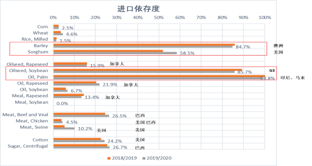 谈及进口,首先看下我国进口依存度,相对而言,谷物能量较蛋白进口而言依存度低。对于没有配额限制的高粱、大麦、DDG等进口依存度较高,其价格波动及进口量级也易受关系变化。