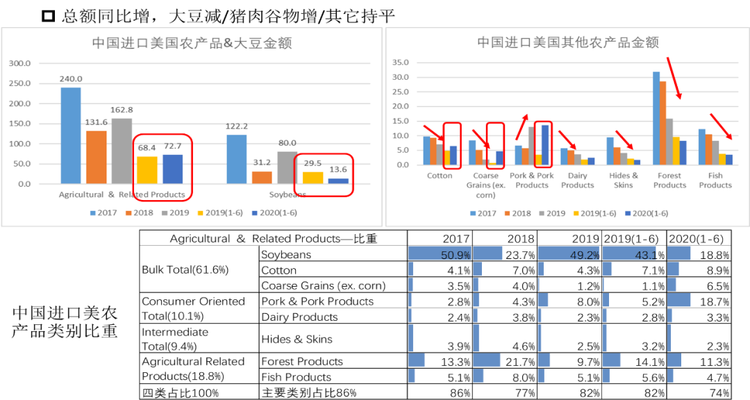 统计口径存在差异,商务部发布版本来看,以美方统计口径测算,2017年农产品进口农产品240亿美元,第一、第二年分别增加125、195亿美元农产品。受新冠疫情影响,今年上半年中方进口完成率偏低,中国商务部口径进口79.35亿美元,占比2017年全年基数的33%;美国商务部口径72.7亿美元,占比2017年基数的30%。按照2017年农产品进口基数来看,大豆比重占比一半,粗粮仅占3.5%。受季节性影响,今年上半年中方大豆进口更多来自巴西(创历史新高),同比看,上半年进口高于去年同期;分类别看,1-6月各主要农产品猪肉、棉花、粗粮的进口大幅增加。