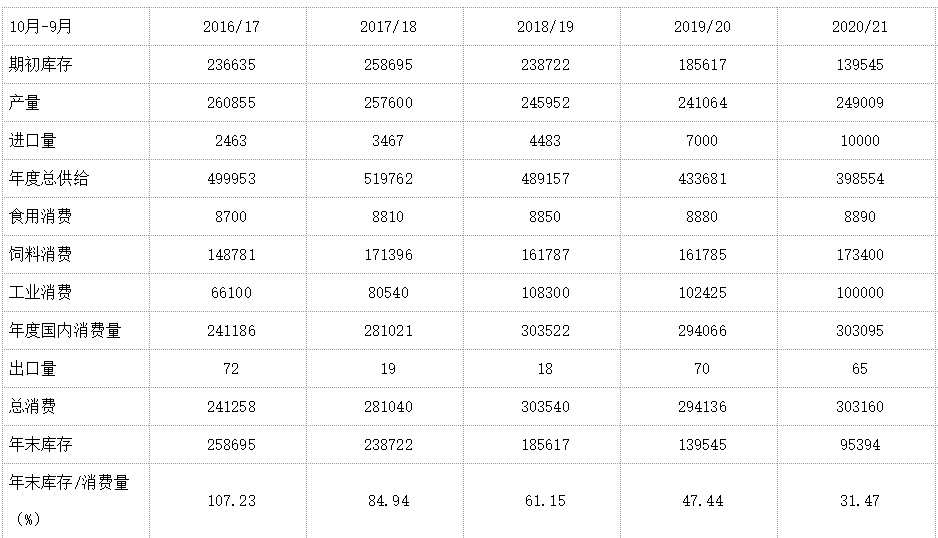 玉米新作的缺口已成共识,无论官方机构还是第三方咨询机构均预计对2020/21年度产需缺口,其中农业农村部8月供需报告预计结余-1155万吨,国家粮油信息中心预计结余-2454万吨(饲用增幅-2%),USDA预估结余-1000万吨(饲用增幅0.05%),第三方资讯机构JCI预计结余-4415万吨(饲用增幅7%)。缺口预期定性的判断一致,但定量的预估差异较大,更多的争议来自饲用需求端恢复程度。根据能繁母猪存栏的恢复程度推算,笔者认为明年猪料恢复在18-20%,整体饲料增幅8%,结合近几年的拍卖成交和价格走势看,笔者预计新作产需缺口在4000-5000万吨左右。