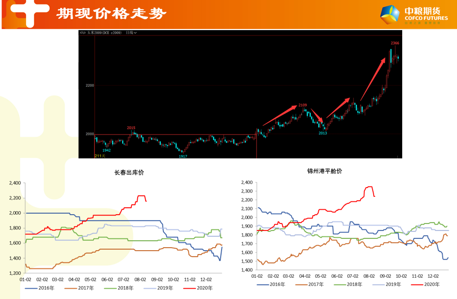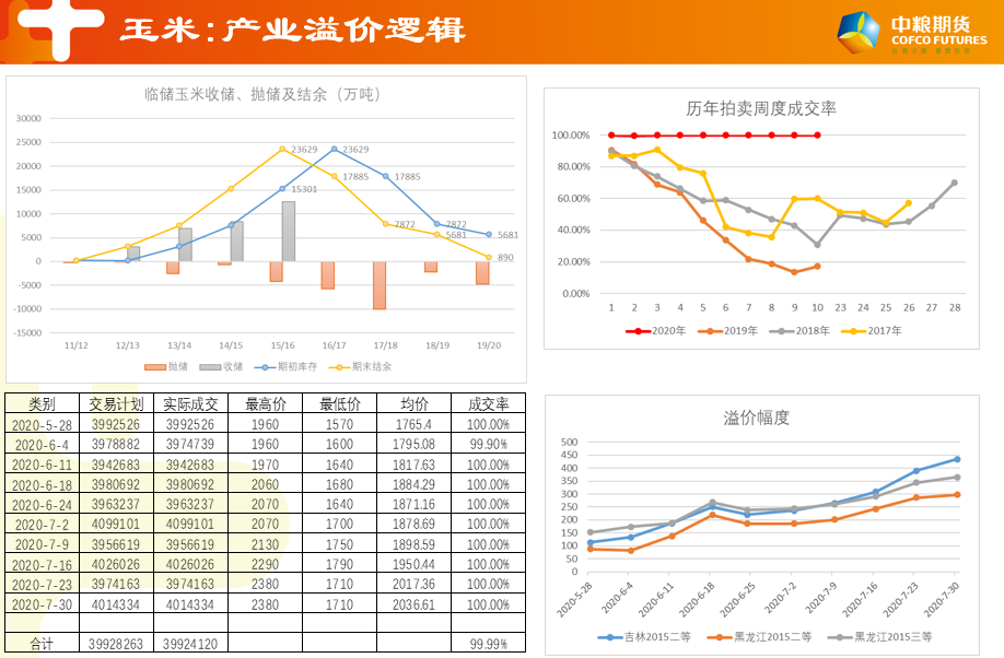 虽然近期有部分贸易商开始出库兑现利润,但面临着没有临储粮的新作,长期看多的氛围仍存,在8-10月份新粮大量上市前,供需端仍是偏紧的节奏。近期政策端开始调控,山东定向深加工、一次性储备拍卖增加产区的投放、小麦稻谷加大拍卖投放等等,未来玉米走势的最大不确定性也是政策的调控。笔者认为,产业格局的大变化趋势未改,中期玉米仍将偏强运行。对于8-12月推演来看, 8月难以形成出库供给压力;9月春玉米量小,更多流入深加工;新粮收割上市至节前惜售成为关键词。成本测算来看,前期拍卖成交到港成本将是未来的滚动支撑底,2150-2200或是新粮卖压的底部,如果在加上资金仓储成本及贸易利润,2400或是年底北港平舱价的目标位。