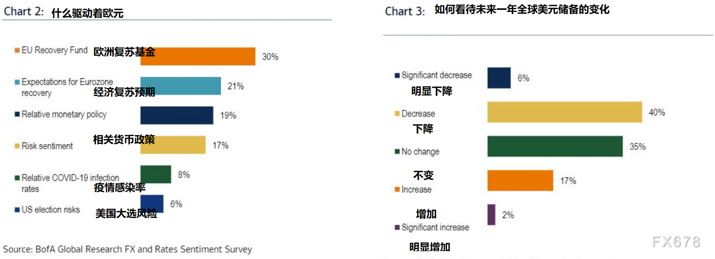 根据美银美林的调查,欧盟经济复苏基金似乎是欧元的主要驱动力(图2)。几乎三分之一受访者表示他们认为6月这一事件是一个重大转折,因此美元的看跌至少可以部分地解释为美元作为储备货币的霸权地位将受到一定程度的侵蚀。