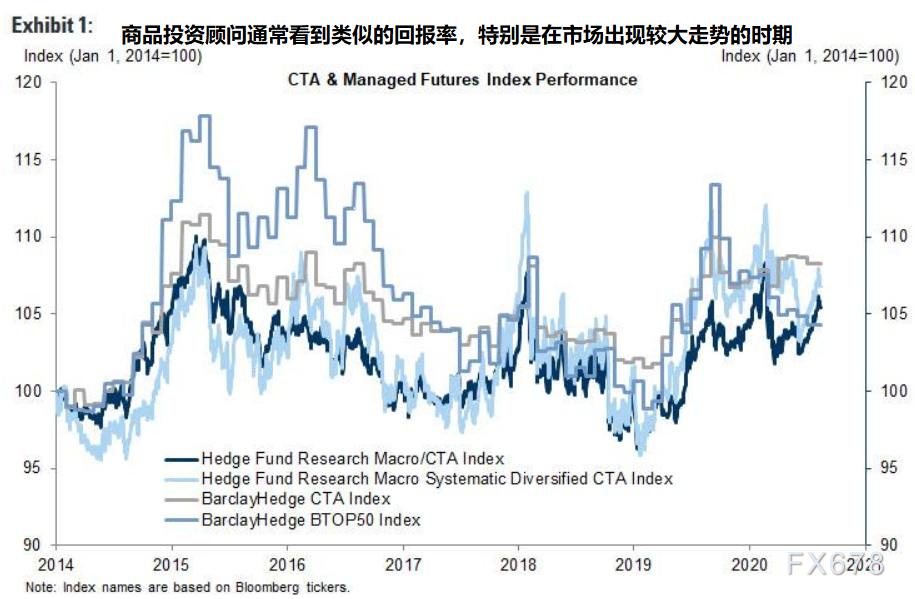 ③尽管不同的交易方法,商品交易顾问往往看到相似的回报,特别是较大的市场波动时期。但事实上,基金之间的收益差异大多来自资产构成、风险水平和头寸规模等因素,而不是具体的交易信号。
