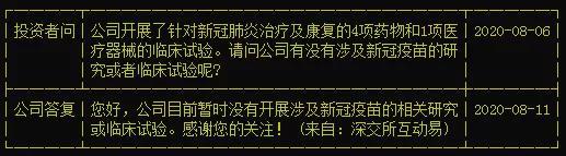 在8月11日,博济医药对此询问答复道:“您好,公司目前暂时没有开展涉及新冠疫苗的相关研究或临床试验。感谢您的关注!”