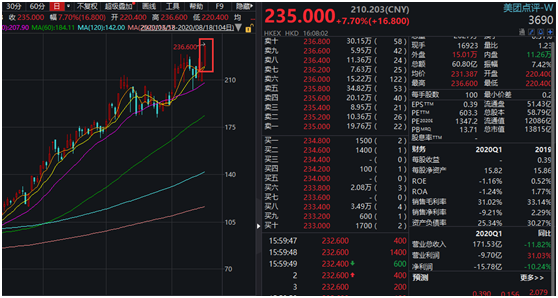 行情数据显示,今天港股美团股价大涨7.70%,收盘报235港元创历史新高。