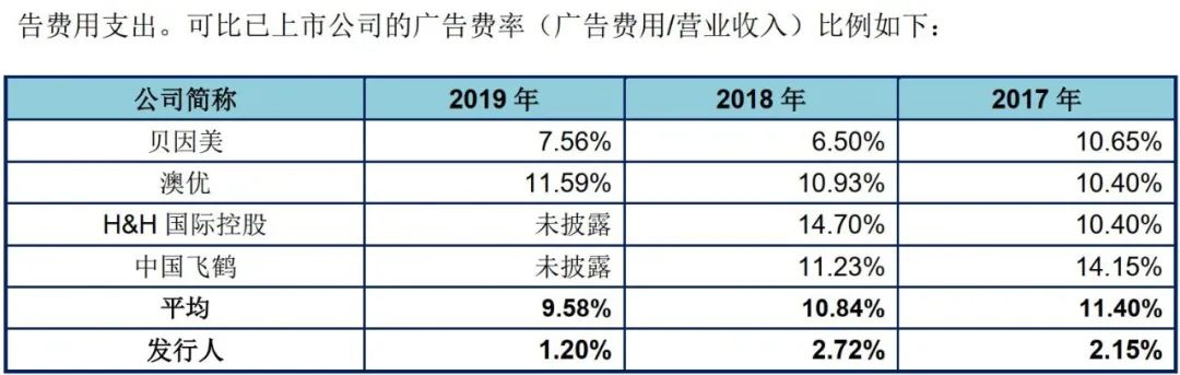 其中,差别最明显的是销售费用中的广告费用项目。2019年公司广告费用仅239.25万元,占营业收入的1%。与同行业动辄数亿、数十亿元的广告投放相比,200多万元只相当于一场小型活动的费用。