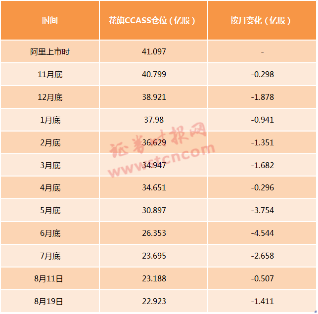 随着香港科技股交投大热,恒指公司5月份宣布接纳第二上市、同股不同权企业,阿里巴巴美股投资者加速搬货来港。下图可见,阿里巴巴来港上市至4月份,花旗仓位累减6.446亿股,5月至8月19日,仓位降幅明显加快,3个月累减12.87亿股,反映阿里巴巴投资者仓位重心逐渐向香港转移。