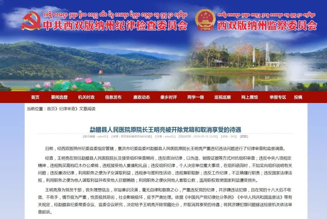 2018年11月,景洪市纪委监委网站发布消息:勐腊县人民医院原院长王明亮涉嫌严重违纪违法,经西双版纳州纪委监委指定景洪市纪委监委管辖,目前正接受纪律审查和监察调查。
